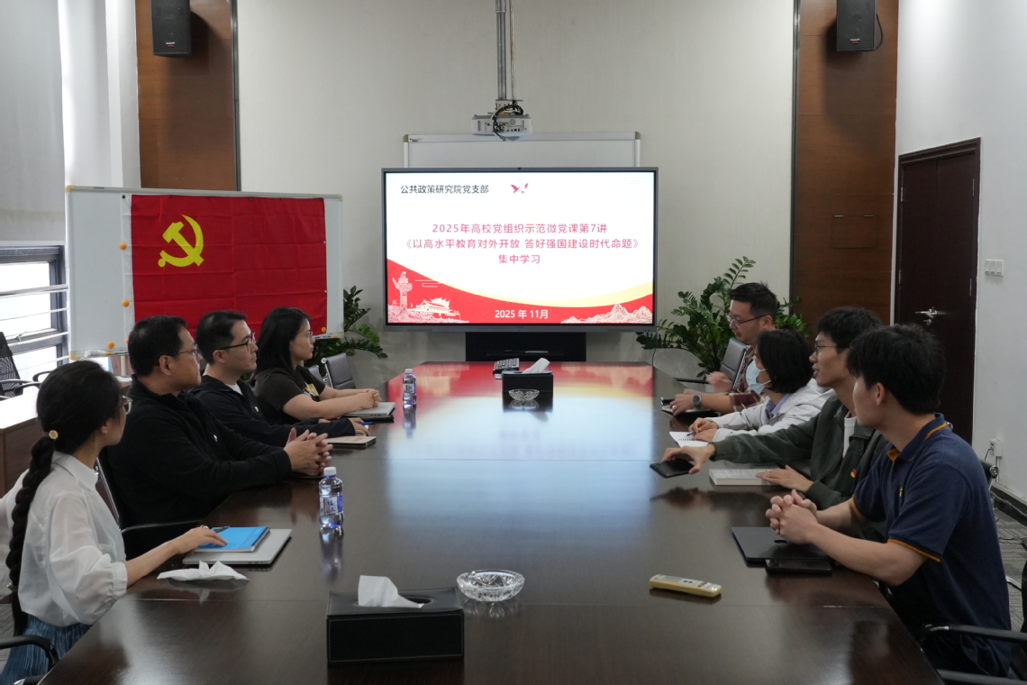 2025年11月7日下午16:00,由教育部思想政治工作司主办、教育部宣传教育中心承办的“2025年高校党组织示范微党课第七讲”——《以高水平教育对外开放 答好强国建设时代命题》在新华网、光明网、央视网、微言教育等多个平台同步播出。华南理工大学公共政策研究院(IPP)党支部全体成员当天在研究院观看和集体学习本次党课内容。