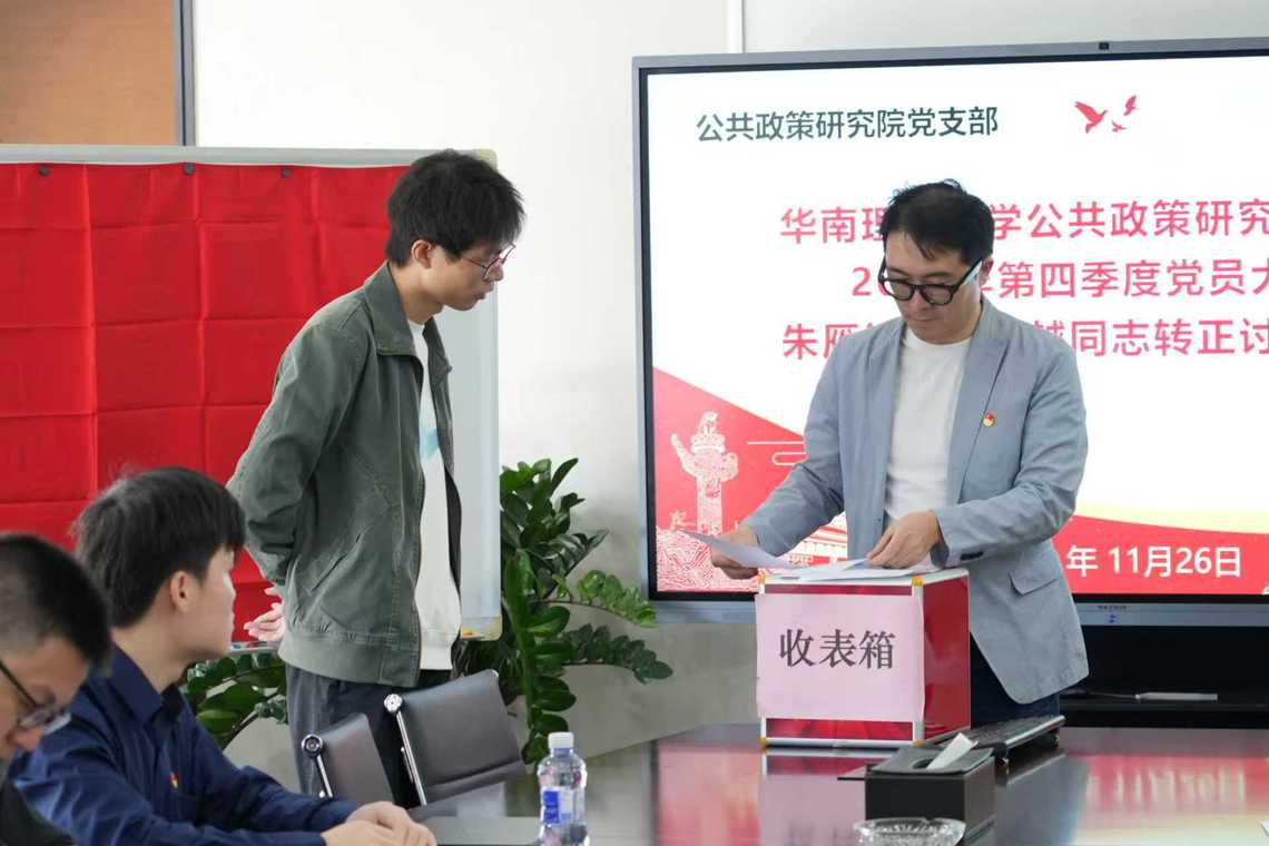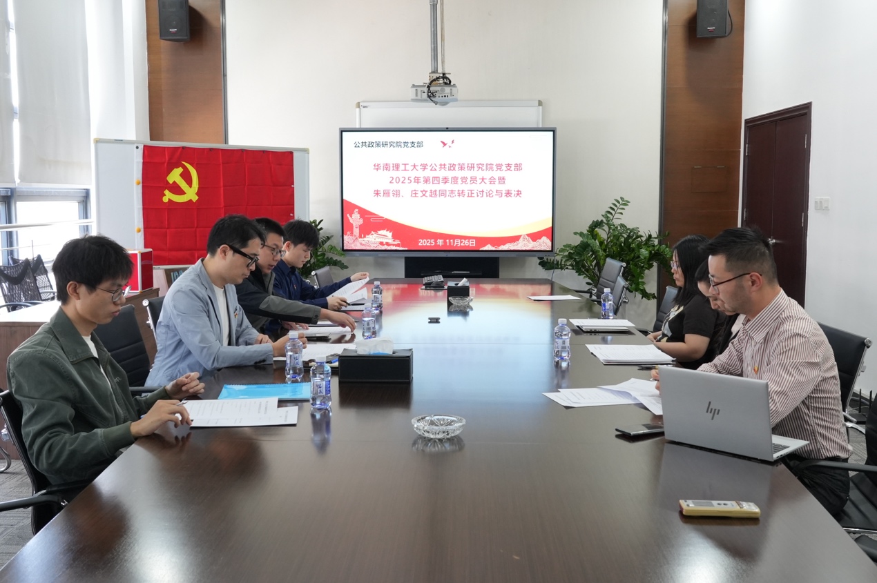 11月26日,华南理工大学公共政策研究院(IPP)党支部召开2025年第四季度党员大会暨朱雁翎、庄文越同志转正讨论与表决会议。研究院党支部书记刘金程主持本次会议。