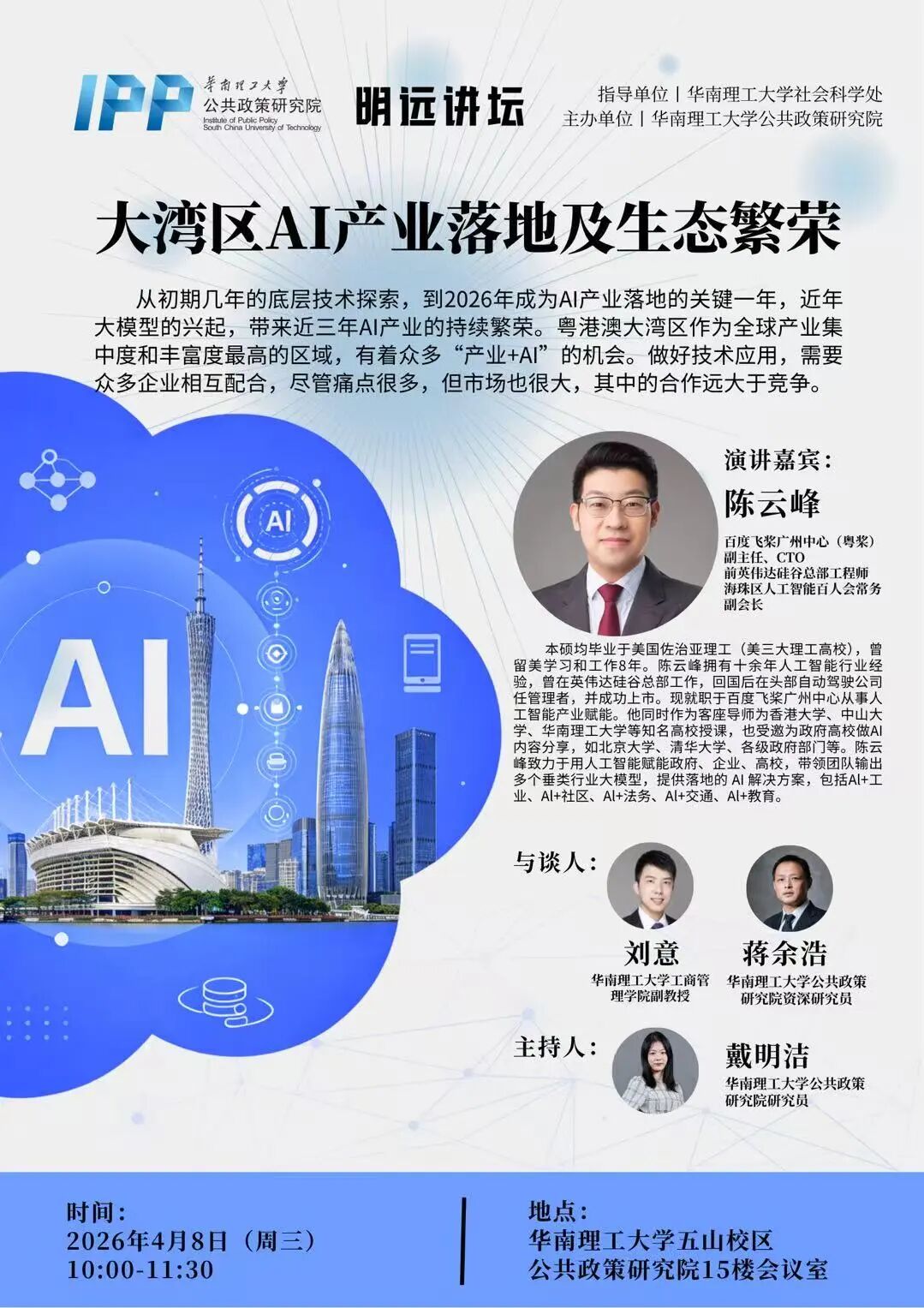 陈云峰本硕均毕业于美国佐治亚理工(美三大理工高校),曾留美学习和工作8年。陈云峰拥有十余年人工智能行业经验,曾在英伟达硅谷总部工作,回国后在头部自动驾驶公司任管理者,并成功上市。现就职于百度飞桨广州中心从事人工智能产业赋能。他同时作为客座导师为香港大学、中山大学、华南理工大学等知名高校授课,也受邀为政府高校做AI内容分享,如北京大学、清华大学、各级政府部门等。陈云峰致力于用人工智能赋能政府、企业、高校,带领团队输出多个垂类行业大模型,提供落地的 AI 解决方案,包括 Al+工业、Al+社区、Al+法务、Al+交通、Al+教育。