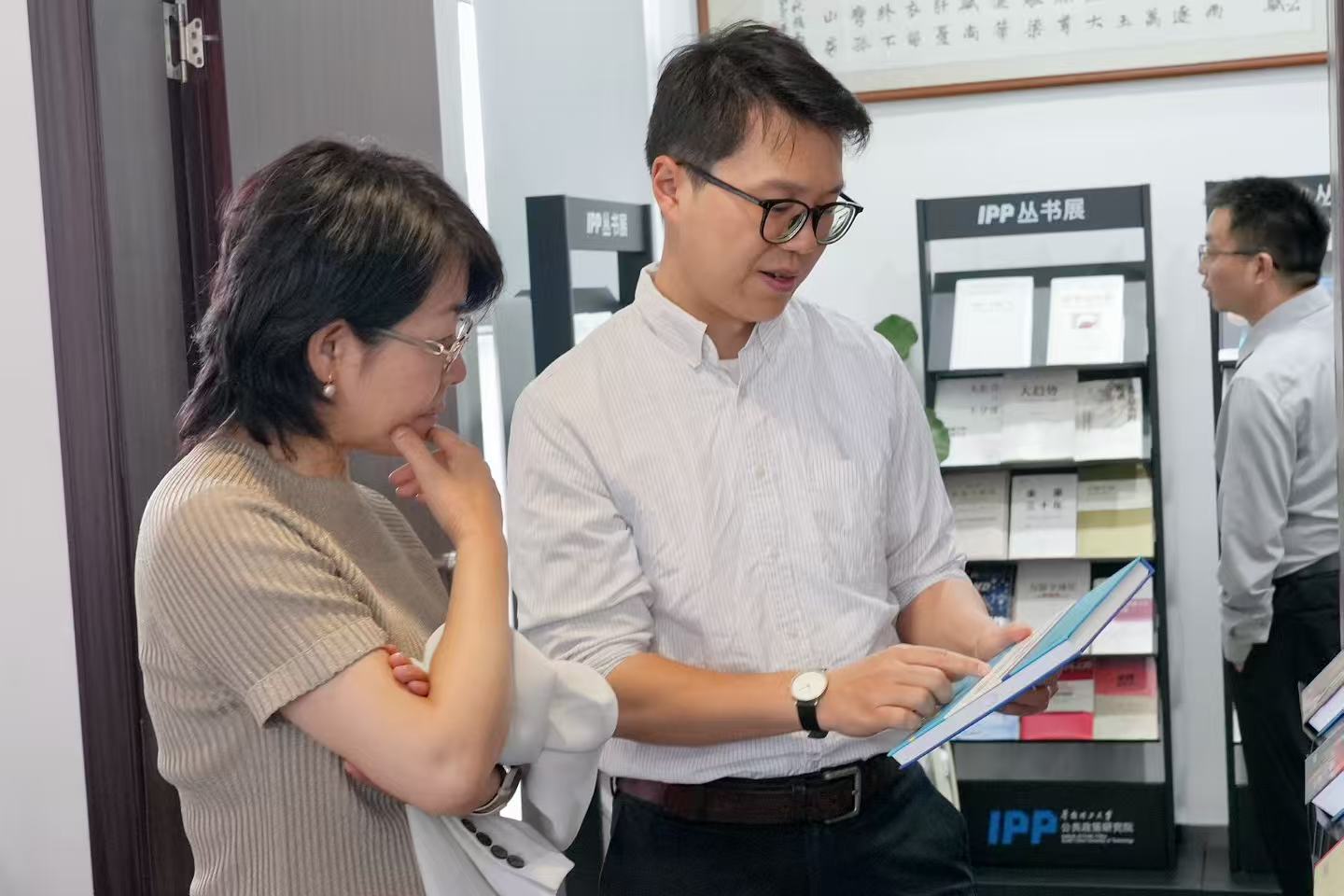 IPP执行院长郭海(右)向杨柳春(左)展示IPP学术出版物