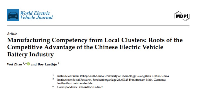 The article titled "Manufacturing Competency from Local Clusters: Roots of the Competitive Advantage of the Chinese Electric Vehicle Battery Industry", co-authored by Professor Zhao Wei and Professor Boy Lüthje from the Institute for Social Research in Frankfurt am Main, Germany, was published in the World Electric Vehicle Journal.Based on first-hand empirical material and data obtained from years of fieldwork carried out at an EV battery cluster in south China, this paper identifies the Chinese EV battery industry’s core competency lies in firms’ core competency and political economic geography,In contrast with the normal point of view, which emphasizes the role of industrial policy. The current core competency of Chinese battery firms is their mass manufacturing capability, which allows them to supply vehicle manufacturers (OEMs) with lithium-ion batteries of stable and consistent quality at competitive prices. Furthermore, the rapid learning and accumulation of knowledge of battery manufacturing on a large scale is also facilitated by the local industrial cluster environment where firms are embedded. The findings have significant implications for battery and car makers in global competition as well as for national and local governments which aim to promote EV battery development.